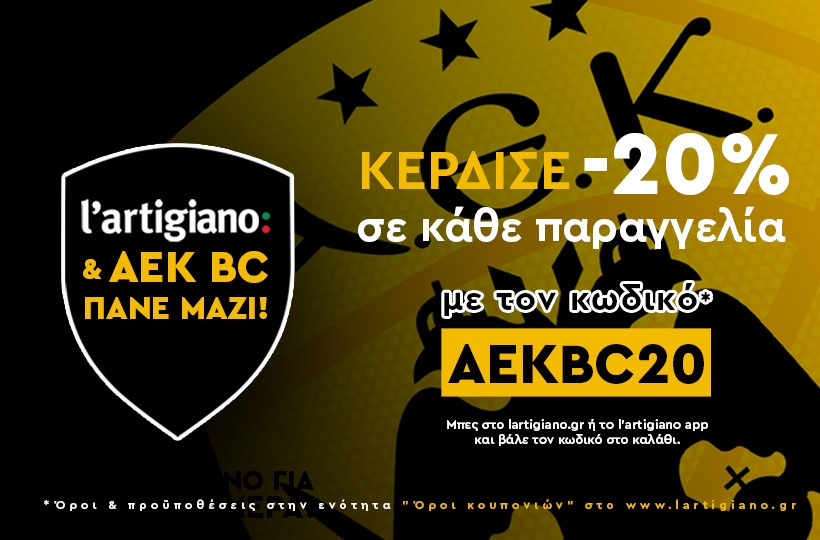 Η l’artigiano και η ΑΕΚ BC ενώνουν δυνάμεις και σου δίνουν 20% έκπτωση στα προϊόντα του online καταλόγου, κάθε φορά που παραγγέλνεις.